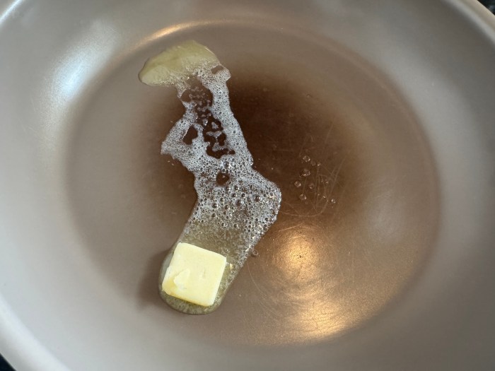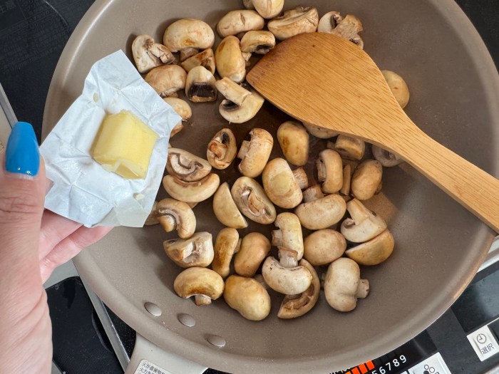 まず熱したフライパンにバターを1かけ。即マッシュルームを投入。