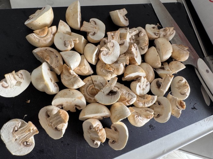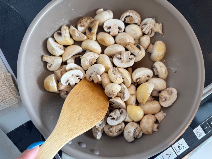 大きめのヤツは半分〜4分の1くらいにカットしておく。マッシュルームは中までしっかり火が通っていなくても食べられるが、「ん……?」って気持ちになるので個人的には火が通っているほうがオススメだ。でも加熱しすぎもダメよ!
