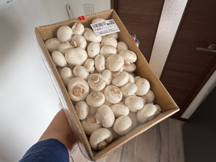 秋はマッシュルームの季節! しかしながら、エノキやシメジほどは頻繁にマッシュルームを食べる習慣のない日本において、マッシュルームは “ちょっと高いキノコ” である。それがオオゼキで山盛り箱入り500円で売られているのを見つけた! 今年は豊作なのだろうか?