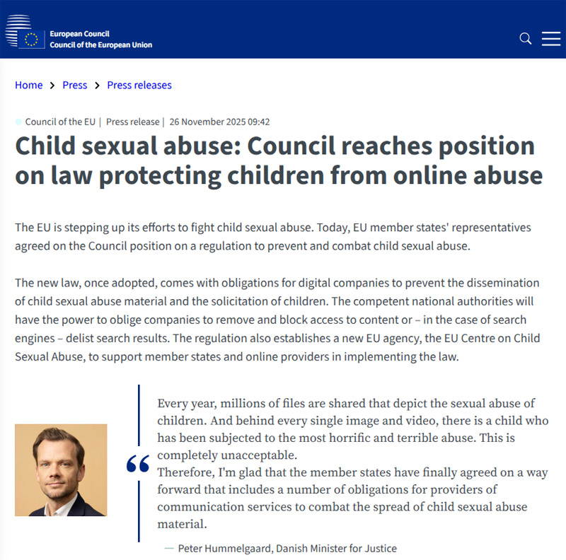 Child sexual abuse: Council reaches position on law protecting children from online abuse(26 November 2025)