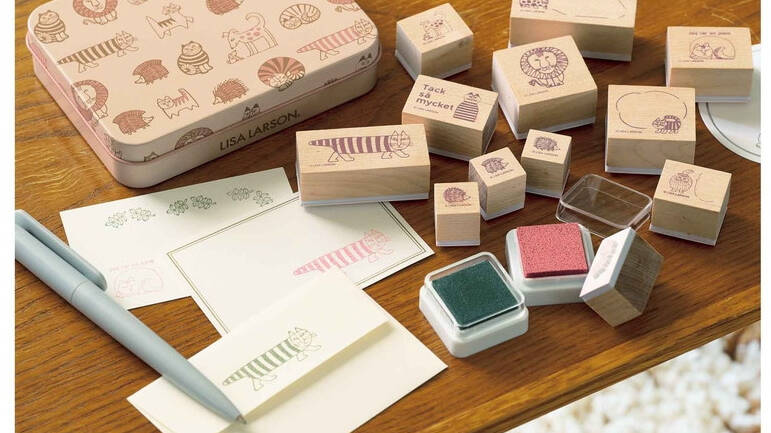 木製スタンプは、マイキーやはりねずみ3兄弟ほか、リサ・ラーソンの愛らしいキャラクターが勢揃いしたデザインの缶ケースに入っています。
