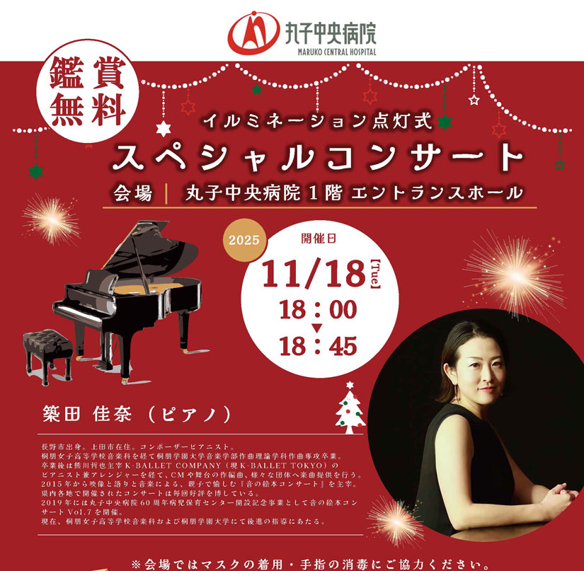 毎年恒例のイルミネーションイベントで、今年も華やかなイルミネーションが病院を彩ります。デザインの担当は上田女子短期大学。同校でもイルミネーションが開催されるほか、「アリオ上田」でも同じテーマで点灯。上田地域を一緒に盛り上げます。