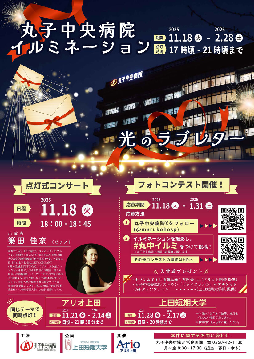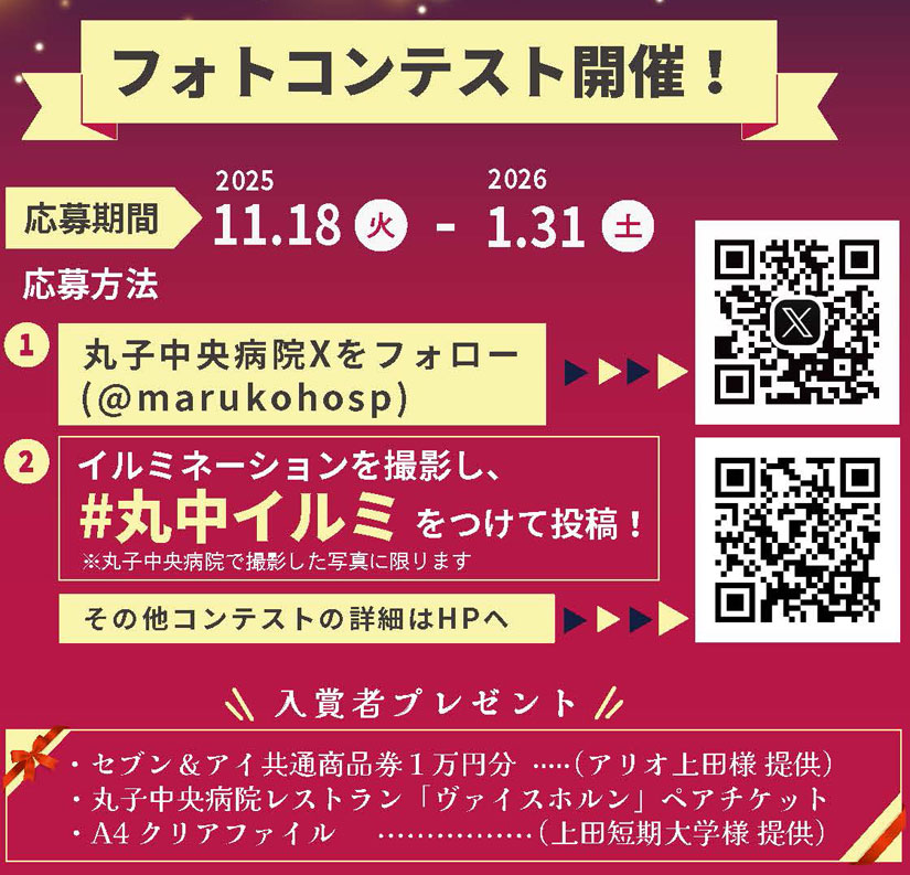 イルミネーションの写真を撮影してXに投稿する、豪華プレゼント付きのフォトコンテストも開催。上田女子短期大学の学生のみなさんが選考し、上位10名を2026年2月上旬頃、病院HPにて発表。