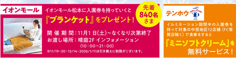 「イオンモール松本」では、イルミネーション利用の入園券を持参すると先着840名にブランケットをプレゼント。