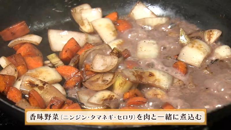 ベースができたら、お肉を一晩冷やすんです。そうすることでぐっと味が染み込んだところを、赤ワインでもう1回温めてから、ソースを足してさらにコクを出します