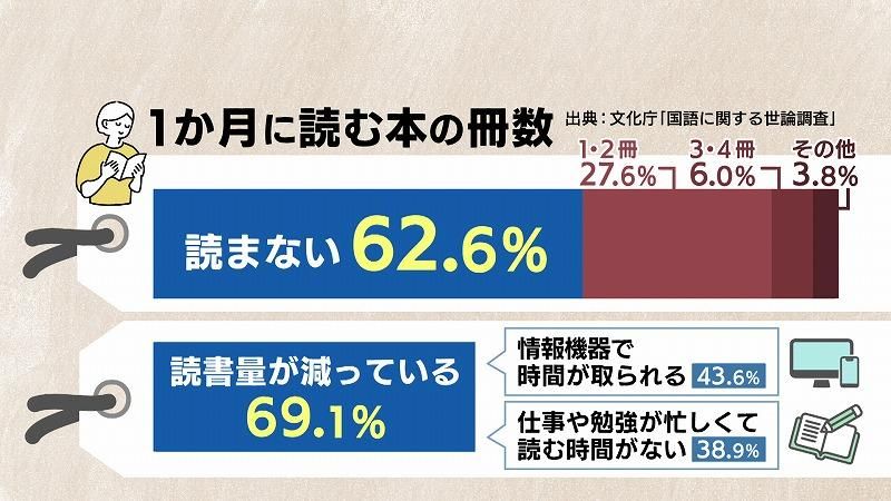 文化庁がおこなった調査では、6割以上の人が「1か月に1冊も本を読まない」と回答。