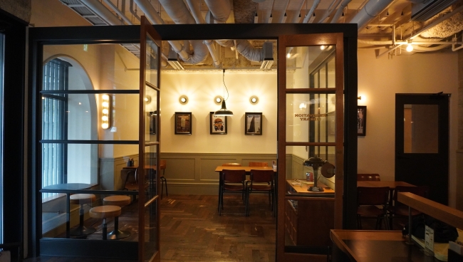 ヴィンテージ感のある看板と扉が印象的な入口。京都の街にありながら、どこか欧米を感じる雰囲気ですね。