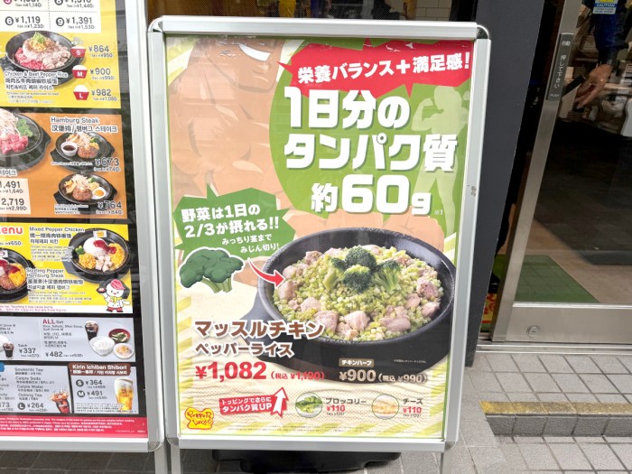ペッパーランチの『マッスルチキンペッパーライス』はブロッコリーの茎をメインに使用し、チキン込みで1食あたり約60gのたんぱく質を実現。成人男性の1日の摂取目安量にほぼ匹敵するタンパク質が摂取できるという。