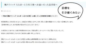 また、立川駅前院の理事長である小林先生の診療を希望する方は、行政手続きの都合上しばらくはららぽーと立川立飛院を予約する必要があるようです。