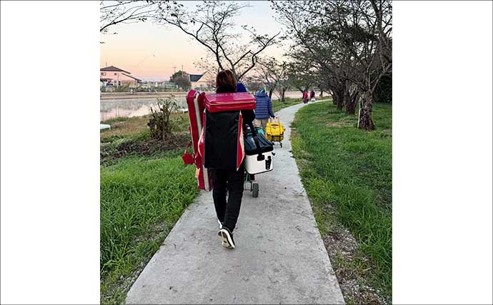 このような時、記者はいつも4輪のキャンプ用カートを使うが、吉田は背負えるライトへらダッフルバッグPA-01とバッカン1個、それにロッドケースとクッションを持ちカートは未使用で行くというから驚きだ。