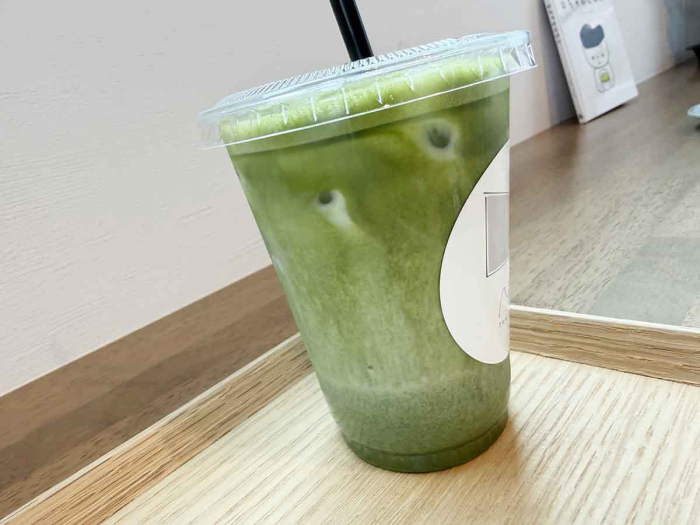 ドリンクは「抹茶ラテ」。抹茶と牛乳、グラニュー糖のみで作られているそうで、一口目は牛乳を感じ、その後じわじわと抹茶の味を感じだすすっきりとした味わい。こちらも甘すぎず苦すぎずのバランスが絶妙です。