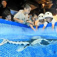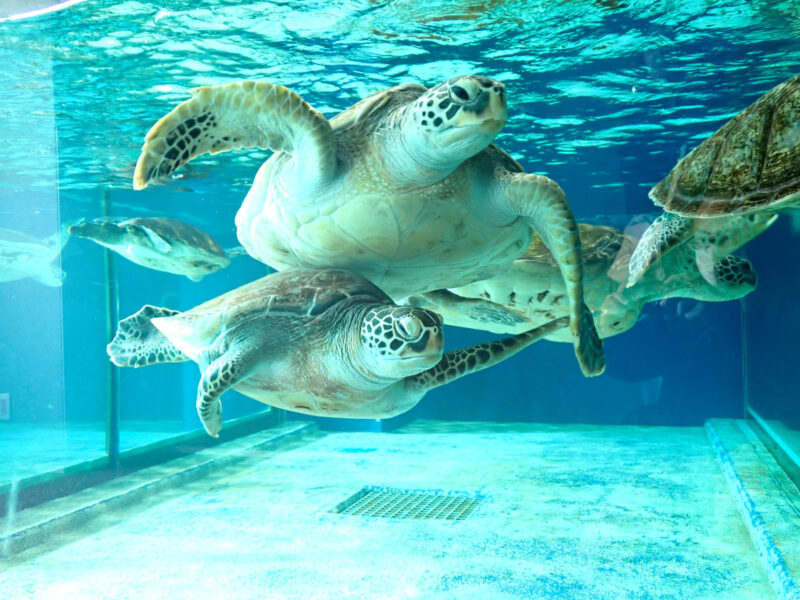 ほぼ360度を観察できるウミガメ水槽もおすすめ。ウミガメがまるで空中を飛んでいるように見える、迫力ある展示方法が特徴的です。