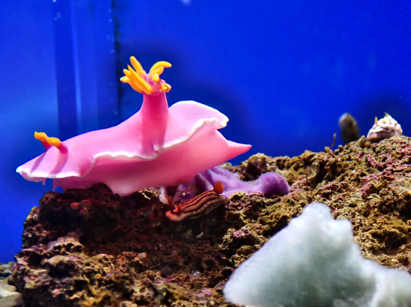 ウミウシ展示も必見。ウミウシは巻貝の仲間で軟体動物の一種ですが、生態はよく分かっておらず、何を食べるのかが不明な種が多いそう。
