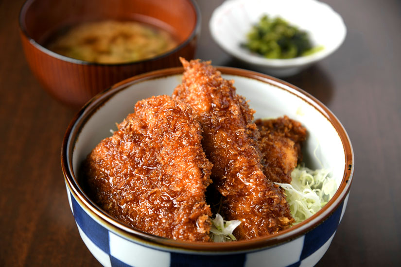鶏をメインとした定食も数種類そろいます。画像の「ソースカツ丼定食」は、とんかつでなくチキンカツを使用! もも・むね・ささみの3種類がのって、豚よりもヘルシーなのにボリューム満点。安曇野産葉わさびとあおさの味噌汁がセットに。