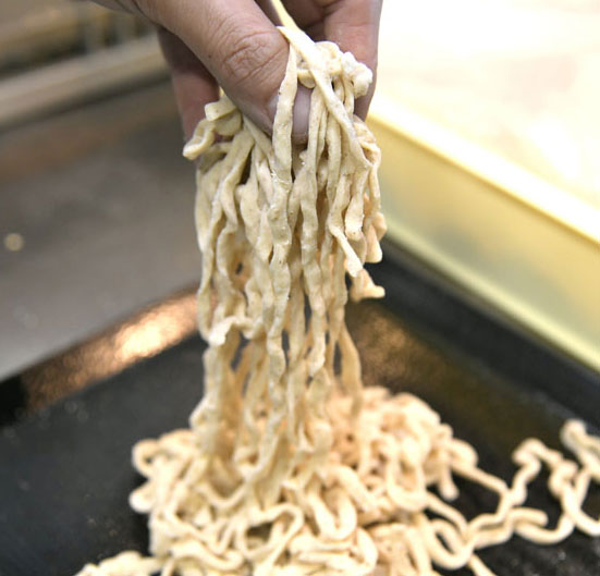 松本市の「横沢麺業」に特注した全粒粉のオリジナル麺は、多加水の手揉み太麺と低加水の細麺の2種を用意。