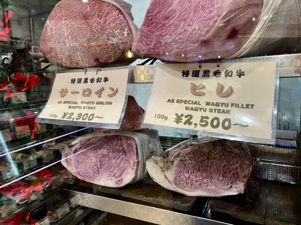 まずは、精肉類。いにしえの創業当初から、新鮮、美味しいと定評がある鶏、豚、牛を扱っていますが、特に正面ケースに鎮座している特選黒毛和牛の〝お姿〟は圧巻!ヒレ、ロースとも後光が指しているようでガラス越しに眺めていても、食欲がマックスになること請け合いです。
