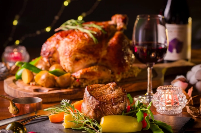 2日間限定で開催されるクリスマスディナーのメニュー数は約60種類。シェフが目の前で仕上げるライブキッチンの料理や、ビュッフェボードにはクリスマスの王道メニュー『ローストチキン』『ブッシュドノエル』、タラバガニやアワビを使用した贅沢なメニューが並びます。
