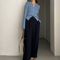 襟付きカーディガンとワイドパンツの組み合わせはバランスがよく、細く見えるのが嬉しいコーデです♡