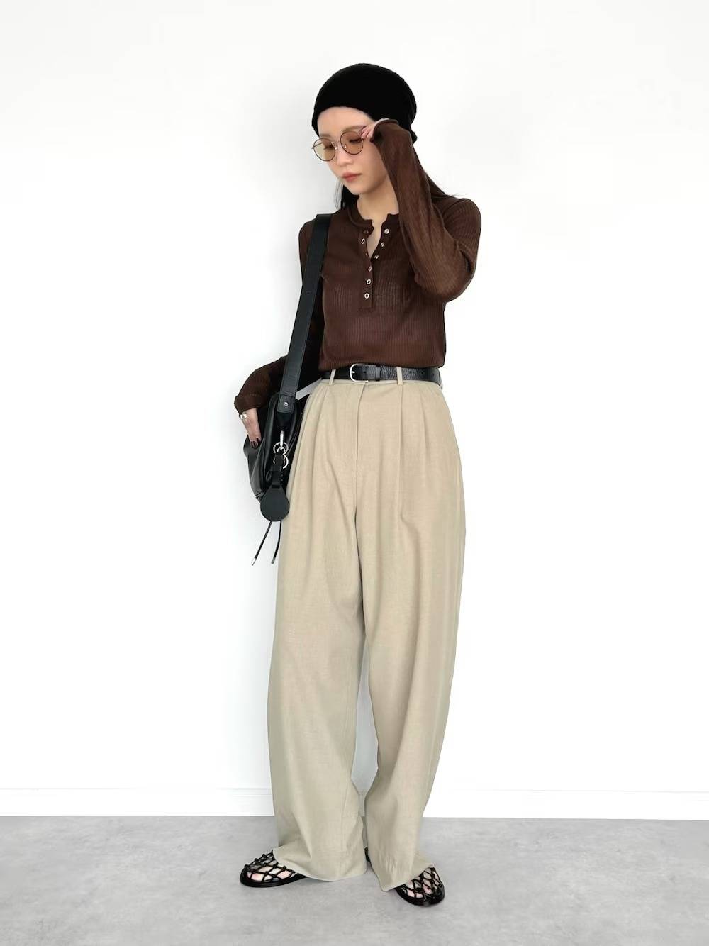 【初秋編】細く見えるワイドパンツコーデ③ヘンリーネックのトップスを合わせる!