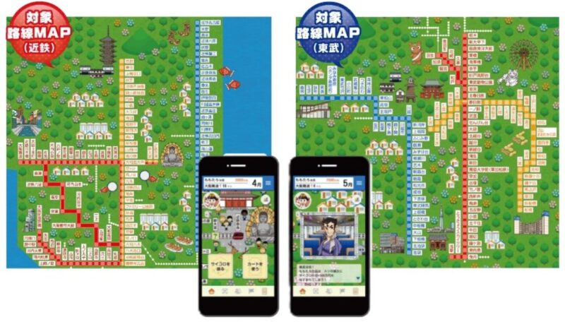 このイベントは個人の総資産を競うだけではありません。ゲーム開始時に「チーム東武」か「チーム近鉄」のどちらかに所属し、チームメンバー全員の総資産額で勝敗を競う団体戦(東西対決)も同時開催されます。仲間と協力して自軍を勝利に導きましょう。勝利チームのプレイヤーにも抽選で賞品が贈られます。また、ゲームを有利に進めるアイテムとして、東武の特急「スペーシア X」や近鉄の特急「ひのとり」をモチーフにした“急行系カード”も登場。うまく使ってライバルに差をつけましょう。