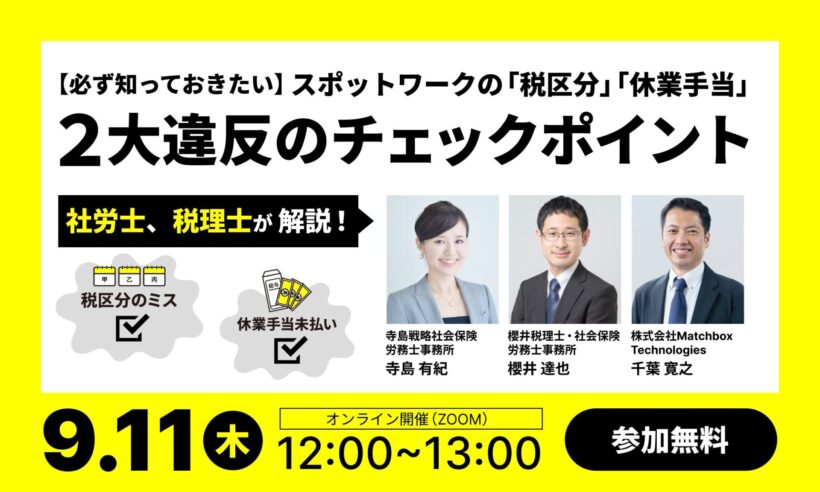 株式会社Matchbox Technologies(新潟市中央区)は9月11日12時から113時まで、スポットワーク雇用における法令違反リスクに関するオンラインセミナーを開催する。