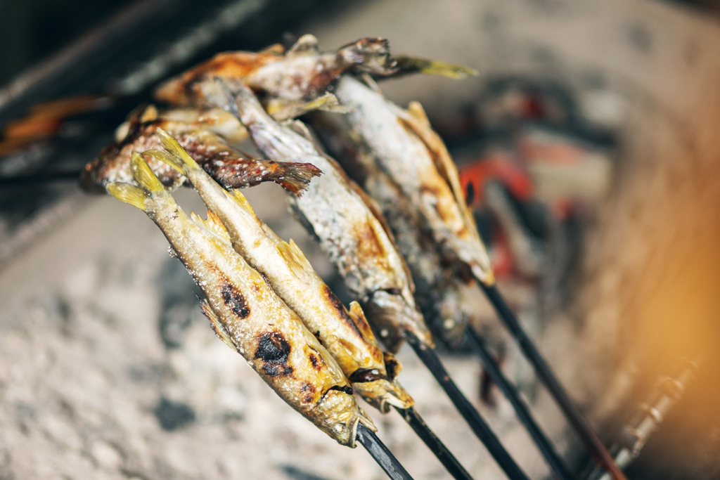 おなかを切ってあるのがあまご、脂がのって女性や子どもにも人気。鮎の味わい深いうま味はツウ好み。各700円。