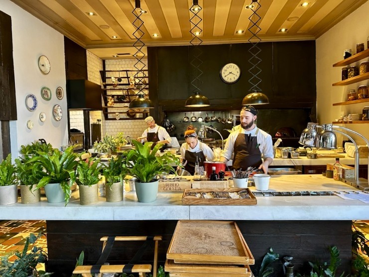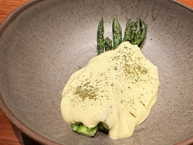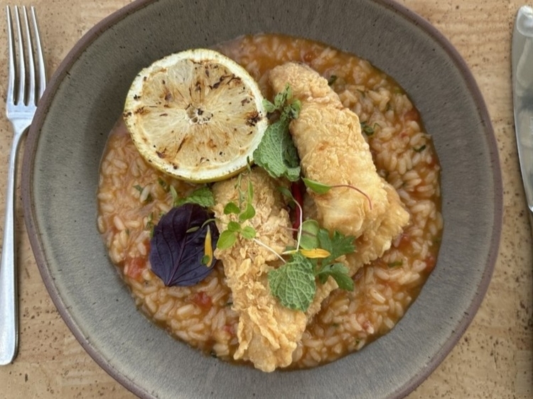 地元産のスパークリングワイン「ムルガネイラ(Murganheira)」で喉を潤し、キヌアのサラダをいただきます。新鮮なブッラータやローストした無花果が入っています。基本的に食材は半径50キロ以内で調達しているそうで、ワインもほぼこのエリアのものを提供しているそうです。