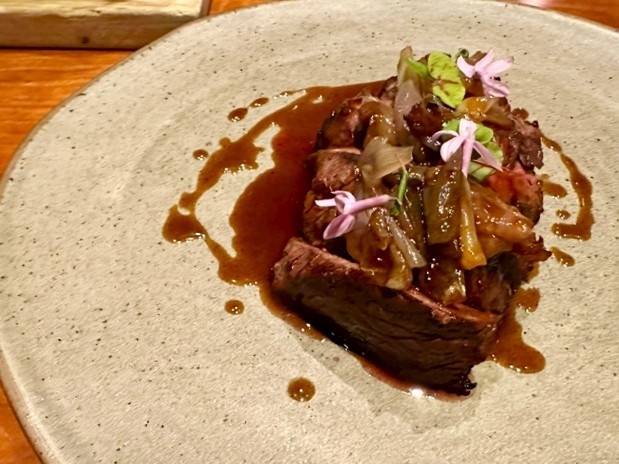 ディナーはメイン・ダイニングで地元のビーフを勧められました。ミニョータというこの地の固有種で、脂身が少ないフィレです。アスパラガスがおいしいよと言われてそちらも。牛肉は柔らかく、添えられたキノコと相まって深い森の香りに包まれています。ホテルのオリジナル・ワインもあったので、それと合わせていただきました。