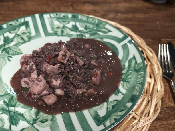 バカリャウのサラダはさっぱりしていて、タコはワインで煮込んだリゾット風になっています。やはりバカリャウやタコの煮込みなどを前にファドが流れてくると、ああポルトガルにいるんだねって気がしますね。