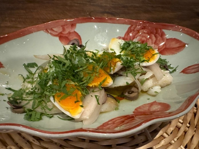 食事はバカリャウのサラダをいただきました。バカリャウとはポルトガルで有名な干しダラのことです。いろんな料理に使われます。サービスの人に言わせると、バカリャウはどこでも食べるけど、タコの煮込み料理はこのエリアの郷土料理だよ、と。