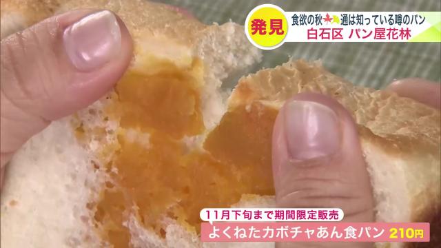 北海道産のかぼちゃを使った「よくねたカボチャあん食パン 210円」は生地にカボチャがたっぷり。11月下旬までの期間限定販売です。