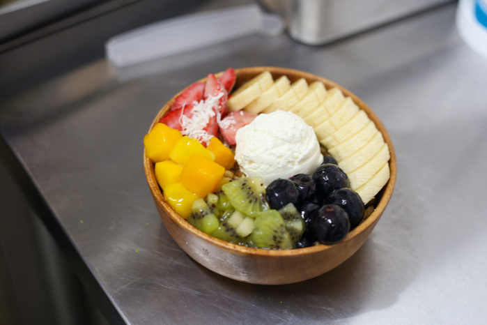 濃厚なアサイーとグリークヨーグルトの2層ベースに、フルーツを全種類のっけた贅沢な一杯です。