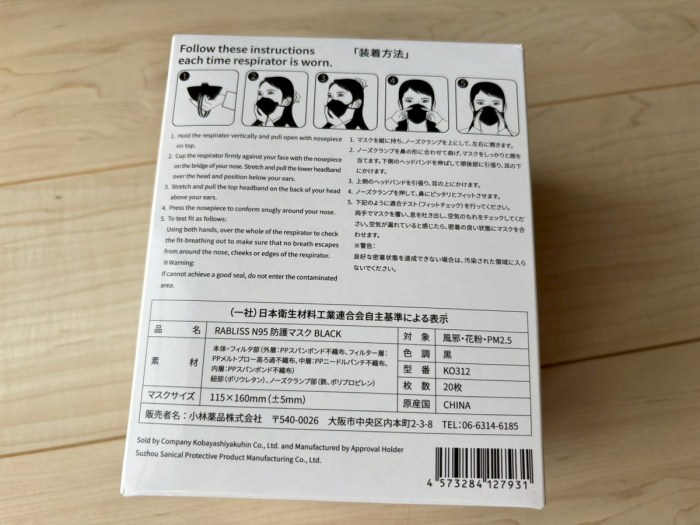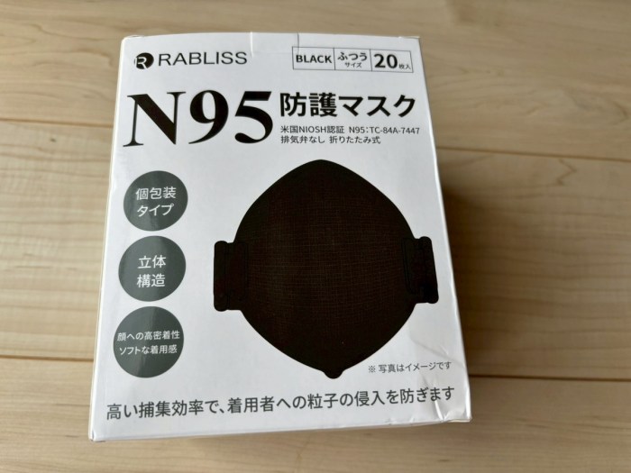 米国NIOSH(労働安全衛生研究所)の規格に合格した微粒子用マスクで、0.3μmの微粒子を95%以上捕集できるN95マスクだそう。