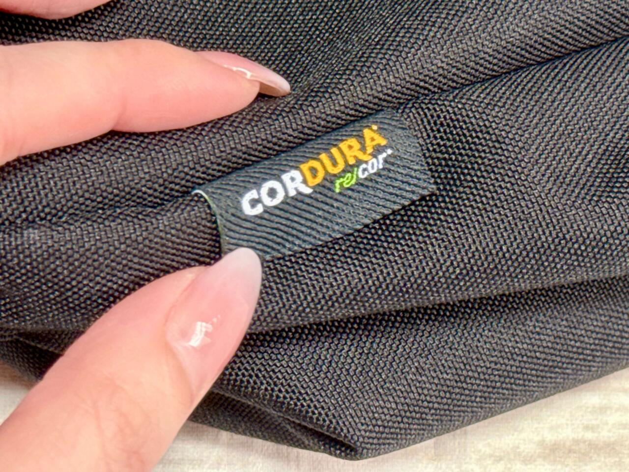 リュックの右下部に注目。「CORDURA」のタグがついており、これは摩耗しにくく耐久性が高い「コーデュラ」という素材が用いられている印です。コーデュラは丈夫なだけでなく、色褪せしにくく「撥水」なので汚れにくい点も推しポイント!