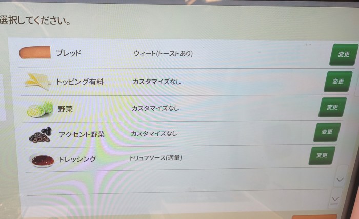 次の瞬間、パンの種類やらトッピングやらを選ぶ項目が大挙して押し寄せてきた。筆者は考えることをやめた。パンの項目には既にお勧めの種類が設定されているそうなので手を付けず、他の部分にも一切触れず、「全ては端末様の御心のままに」という姿勢を貫こうとした。