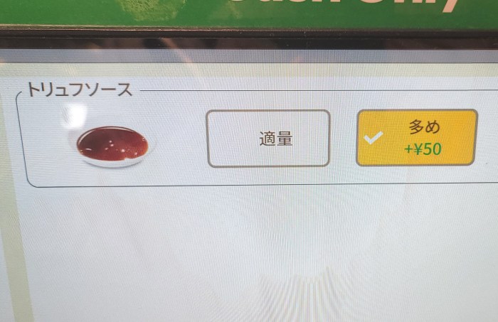 突如として態度を急変させた筆者が画面に触れると、50円を追加で払うことでソースを「多め」にできるオプションが表示された。我が身にとってはこれが適量だとばかりに、迷いなく「多め」を選んだことは言うまでもない。