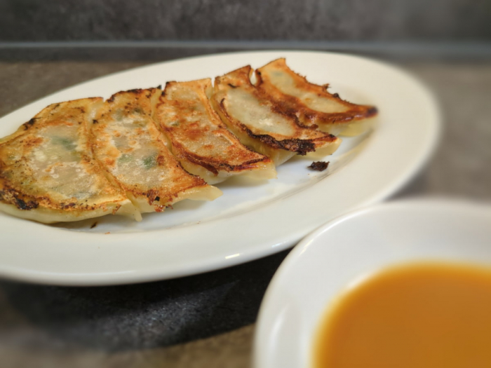 豚ひき肉とニラの入ったパリパリの「餃子」は酢の風味が聞いたまろやかゴマダレで。