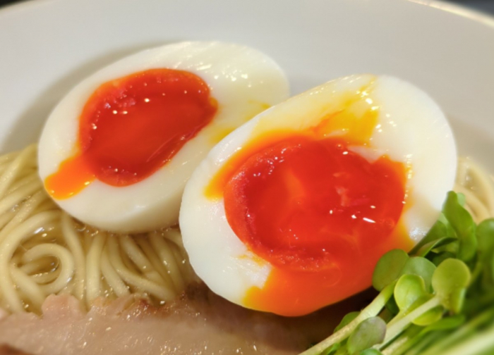 トッピングの煮卵にはブランド卵「高砂の夕日」を使用。木酢液やパプリカ粉を使っていて、濃厚な黄身がとろり。