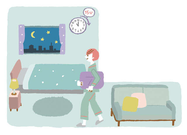 眠れないときは、思い切って布団から離れ、場所を変えましょう。渥美先生曰く「人間関係と同じく、ベタベタしすぎるのはよくありません」。また、布団は何かをするところでなく、「眠る場所」として体に覚えさせることも大切。眠れない状態でずっと布団にいると、布団が「目が覚める場所」として認識されてしまいます。