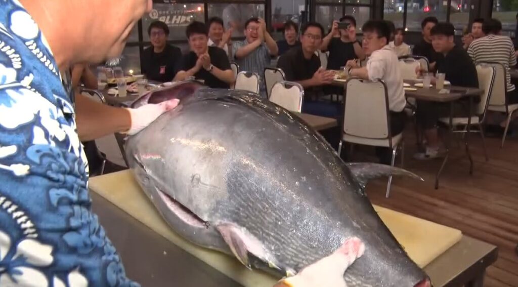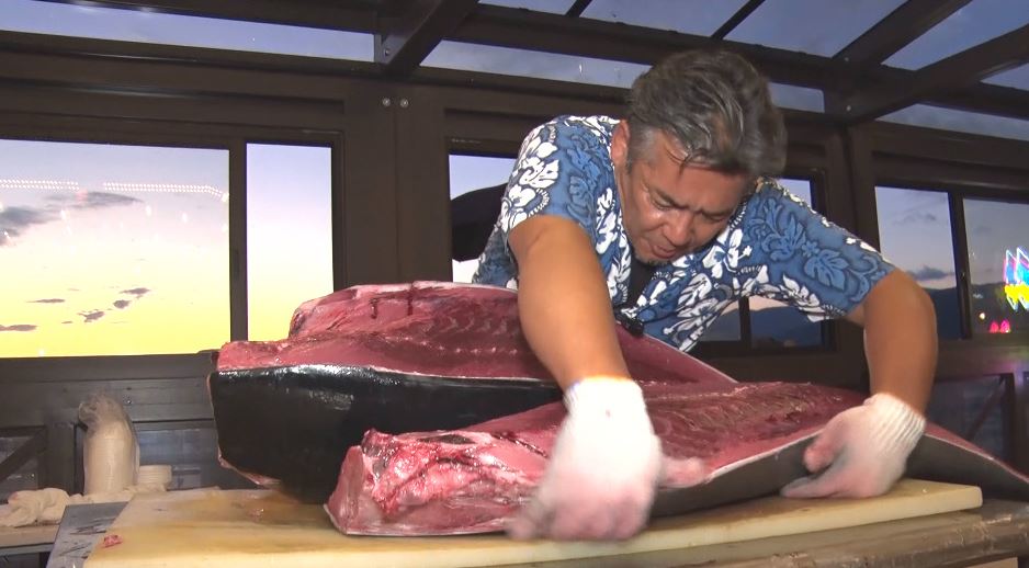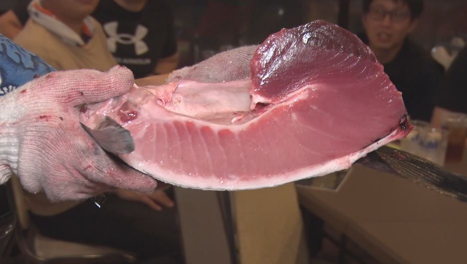 営業初日、客の前に現れたのは重さ60キロの「本マグロ」。松浦社長お得意の解体ショーが始まりました。目の前でさばき、脂の乗り具合を見てもらいます。
