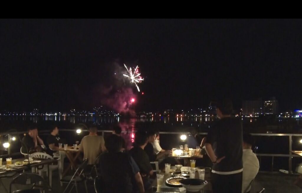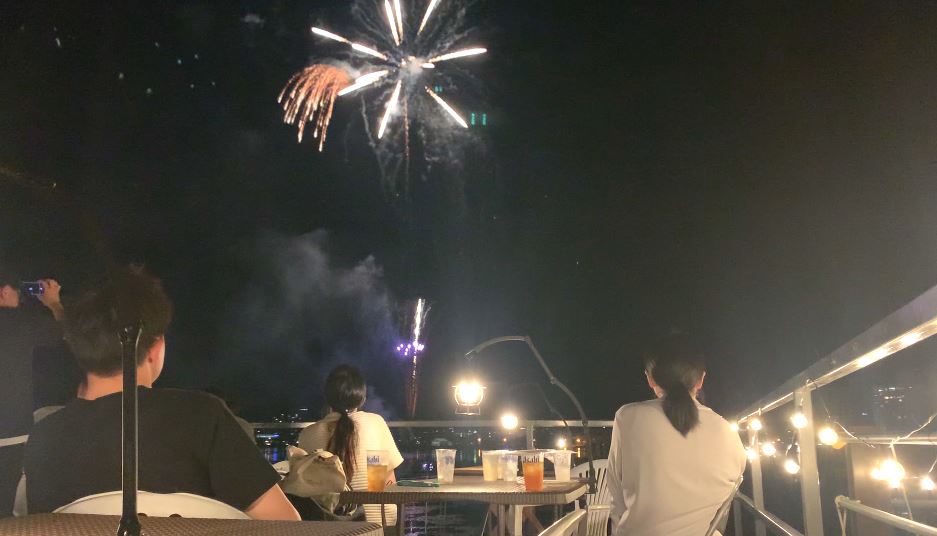 花火が始まると客はテラス席へ。「特等席みたいな感じ。特別感があってよかった」と眺めも好評です。「丸松湖上ビアガーデン」の営業は8月24日まで。8月14日、15日を除いて、毎日午後6時から9時まで営業します。マグロの解体ショーは不定期開催で、インスタグラムで告知するということです。