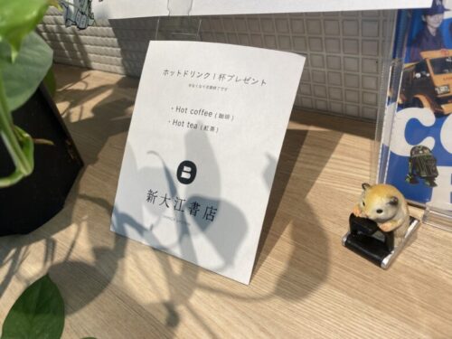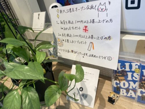 「新大江書店」では、オープン企画として雑貨を1,000円以上購入されたお客様へはお菓子を、本を1,000円以上購入された方へはしおりをプレゼントしています。