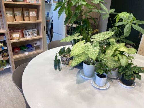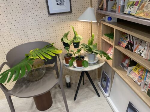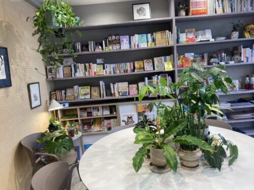 コンパクトな店内は4~5人程が入るといっぱいになりそうな広さです。 中央は、植物が飾られた大きな丸テーブル。右手側には販売している本が並んでいます。