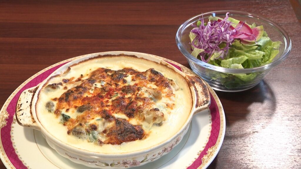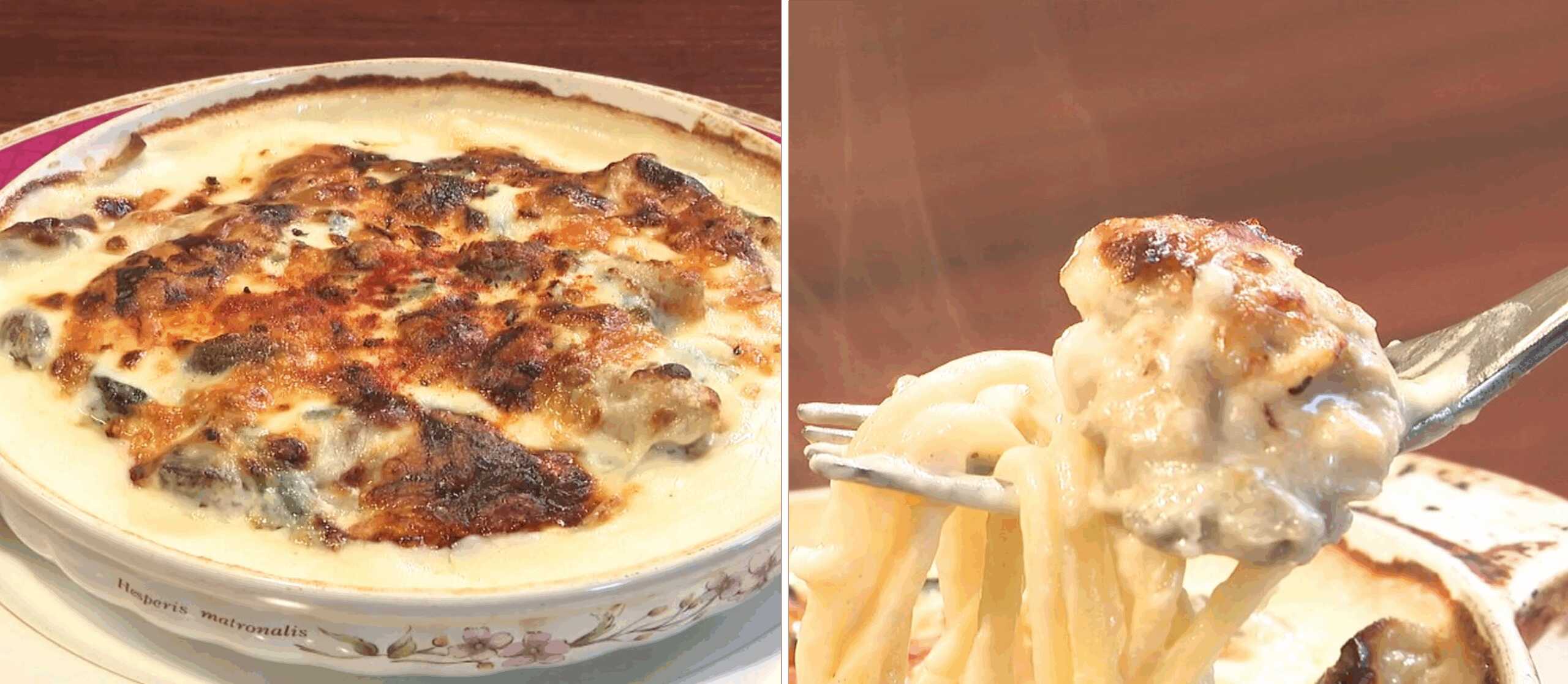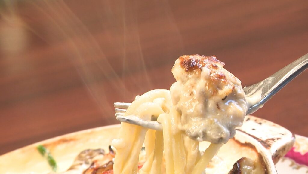 湯気を上げながら運ばれてきたのは、季節限定メニューの「カキのパスタグラタン」。この時期、なんと客の8割以上が注文するという人気の一皿です!
