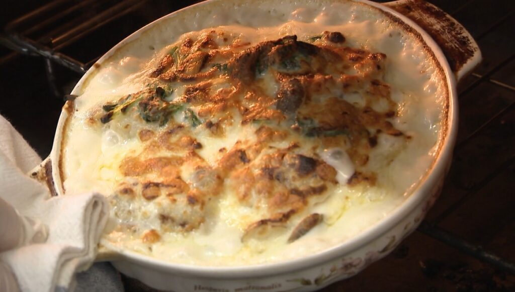 使用するのは「大吟醸」という規格の広島県産生ガキ。それを軽くソテーして、パスタの上に5個のせます。キノコやホウレンソウ、たっぷりのホワイトソースを入れて、オープンで焼き色をつければ完成です。