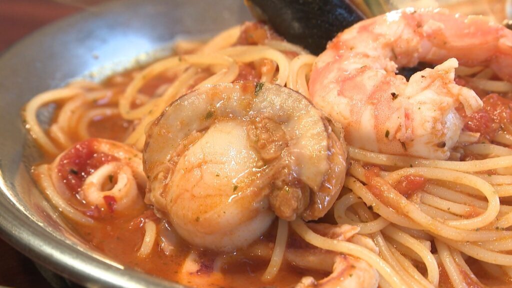 もう一つ、おすすめのあったかメニューがあります。バジルの香りが広がる「元祖海鮮トマトソースパスタ」です。
