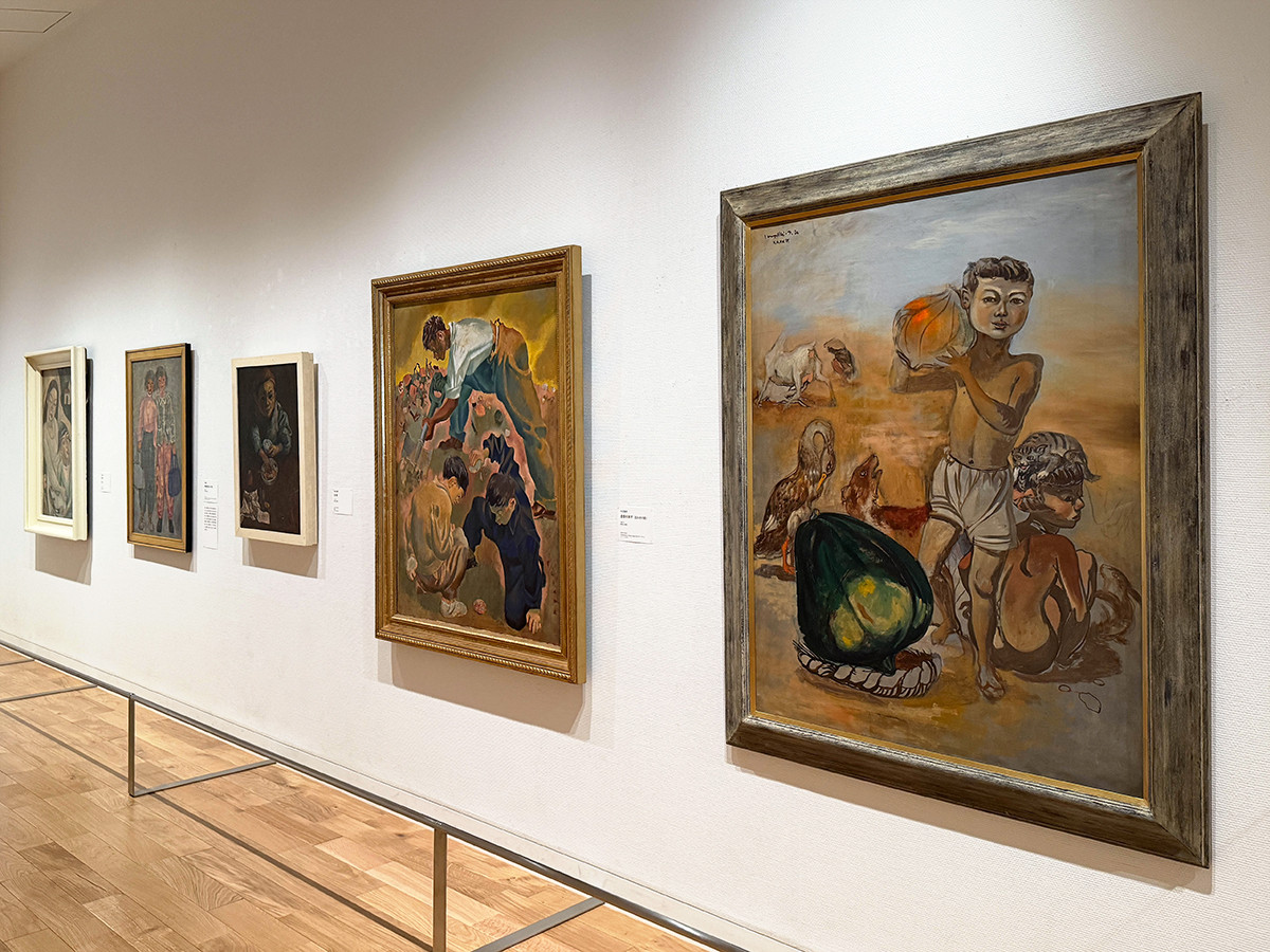 展覧会は第1章「童心の表情」から始まります。大正時代の自由主義的な思想の流れを受け、日本では1920年代から30年代にかけて、純粋で無垢な子どもたちのイメージが広がり、画家たちも無邪気に遊ぶ姿やあどけない表情を捉えました。