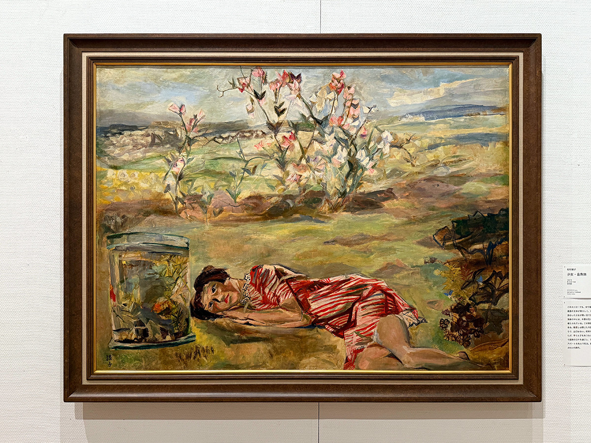 松村綾子の《少女・金魚鉢》は、切り裂くように鋭い筆致と刺々しい画面全体が「痛い」という印象を与えます。少女の眼差しは閉じた内側に向かい、出口のない物語を入れ子状に示唆しています。