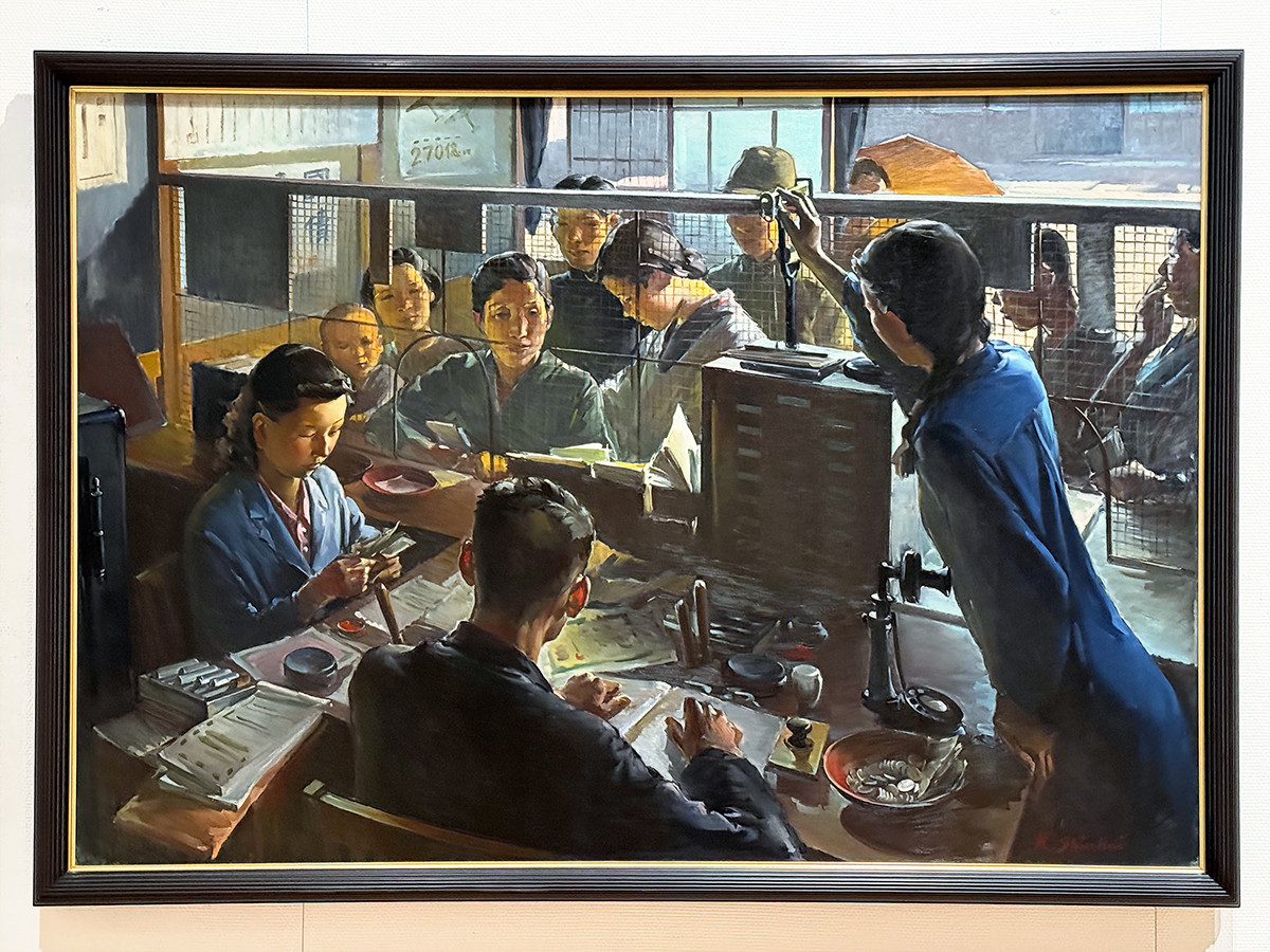 新海覚雄の《貯蓄報国》は、貯金に訪れる人々を描いた作品。太平洋戦争開戦以後、出征者が増えたため、女学生も労働力として借り出され、窓口に並ぶ人々も子ども連れや割烹着(かっぽうぎ)姿の女性が目立ちます。