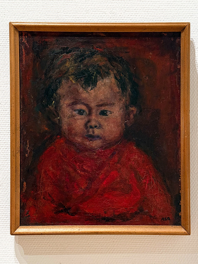 麻生三郎の《一子像》は、1944年(昭和19年)1月に生まれた長女を描いた作品です。麻生は戦後、戦争末期から終戦直後に「子どもを見ていると描かなければいけない」と感じたことを振り返っています。